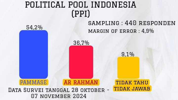Di sisi lain, PPI menunjukkan hasil yang berlawanan, di mana Pammase unggul dengan elektabilitas 54,2%, sementara Ar-Rahman berada di angka 36,7%. Sebanyak 9,1% responden belum menentukan pilihan. Survei ini dilakukan dengan 440 responden dan memiliki margin of error 4%.