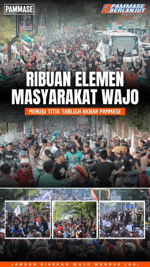 Para pendukung hadir dresscode Putih dan mengenakan kaos bertuliskan slogan PAMMASE BERLANJUT, menciptakan lautan dukungan yang memancarkan optimisme. Acara ini menjadi bukti nyata kekuatan solidaritas masyarakat Wajo terhadap pasangan Amran-Amran.