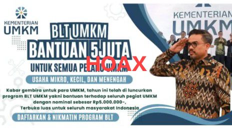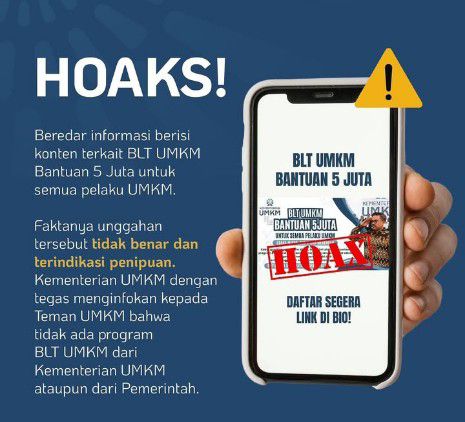 Dalam pengumuman tersebut, Kementerian UMKM menegaskan bahwa informasi tersebut adalah hoaks dan terindikasi penipuan.