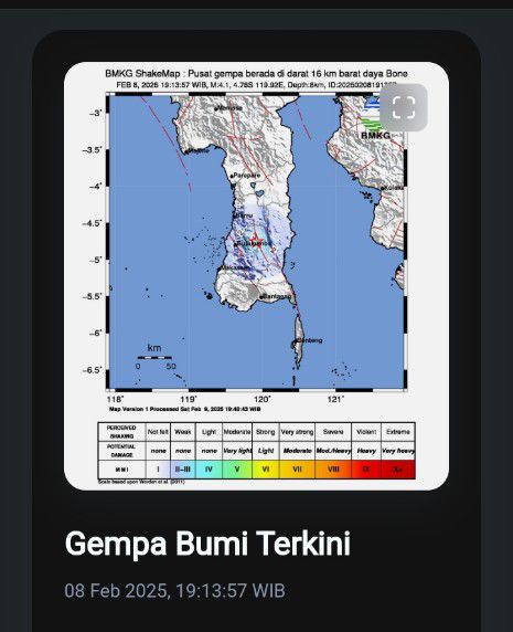 Bone,-Celoteh.Online– Sulawesi Selatan – Gempa bumi berkekuatan magnitudo 4,1 mengguncang wilayah barat daya Kabupaten Bone, Sulawesi Selatan, pada Sabtu, 8 Februari 2025, sekitar pukul 20.13 WITA. Badan Meteorologi, Klimatologi, dan Geofisika (BMKG) mencatat bahwa pusat gempa berada di darat, sekitar 14 kilometer barat daya Bone, dengan kedalaman 16 kilometer.