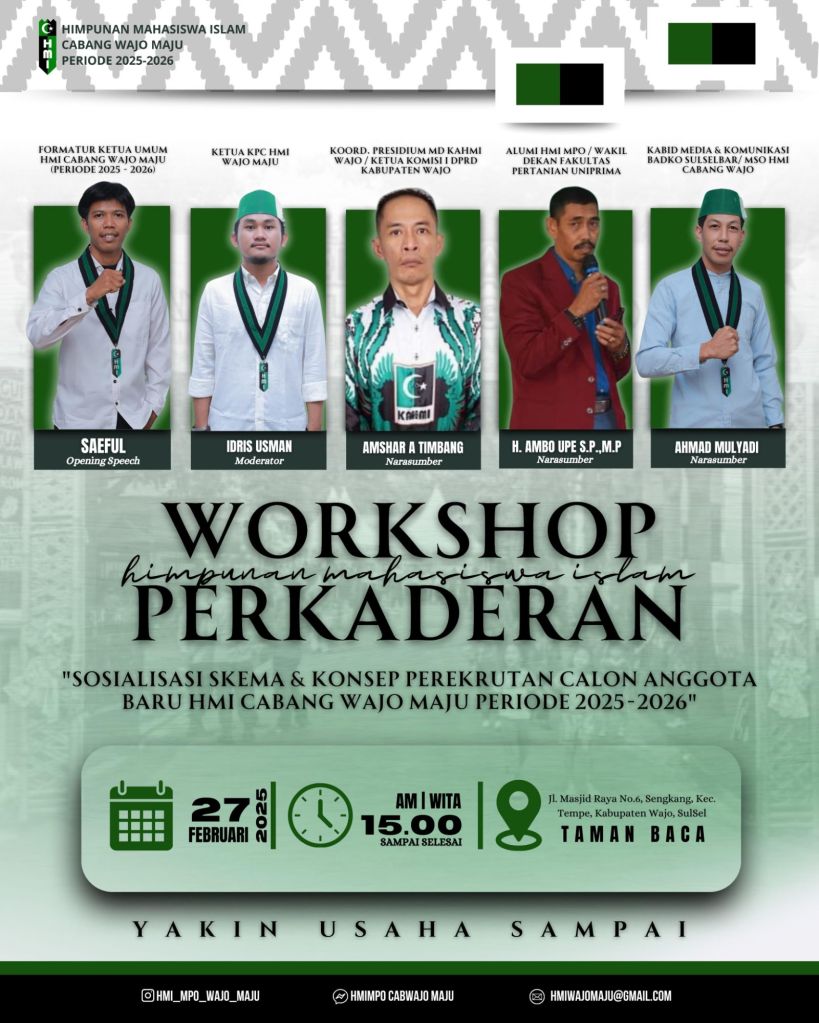 Kegiatan ini yang bertajuk “ Workshop Perkaderan” sebagai sosialisasi skema dan konsep perekrutan calon anggota Baru HMI Cabang Wajo Maju Periode 2025-2026 yang akan menghadirkan pembicara internal HMI yang potensial diantaranya Kakanda Amshar A Timbang (Koord Presidium KAHMI Kab.Wajo/ Ketua Komisi I DPRD Kabupaten Wajo), H. Ambo Upe (Alumni HMI MPO / Wakil Dekan Fakultas Pertanian Uniprima), Ahmad Mulyadi (Kabid Media & Komunikasi HMI Badko Sulselbar/ MSO HMI Cabang Wajo Maju).