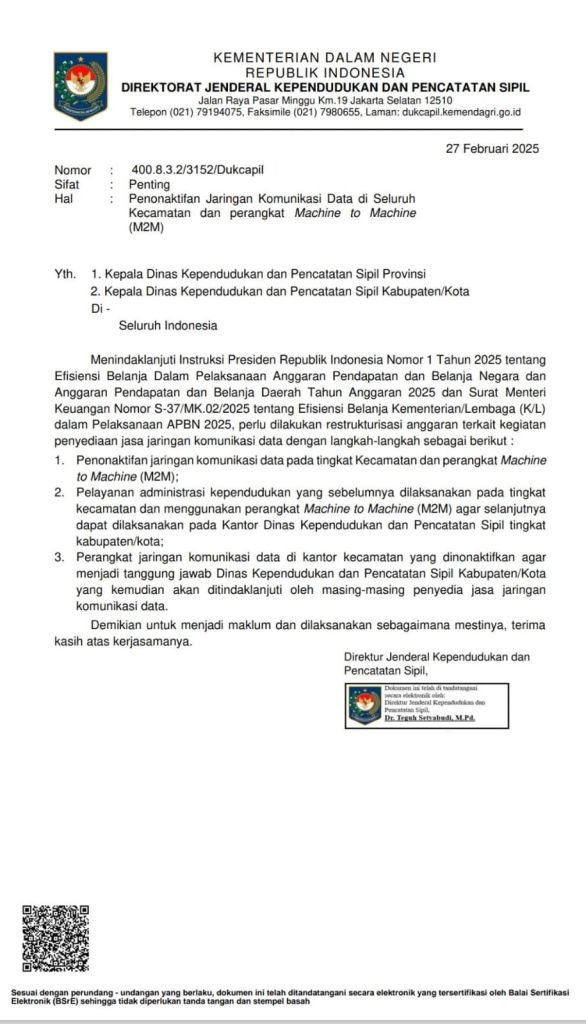 Instruksi tersebut tertuang dalam surat tertanggal 27 Februari 2025, sebagai tindak lanjut dari Instruksi Presiden RI Nomor 1 Tahun 2025 dan Surat Menteri Keuangan Nomor S-37/MK.02/2025 yang mengatur efisiensi belanja kementerian/lembaga dalam pelaksanaan APBN 2025.