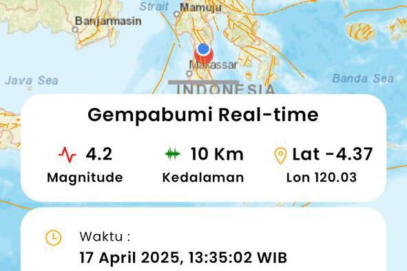 Sementara itu, informasi lain mencatat gempa dengan magnitudo 4,2 yang berlokasi 40 km timur laut Barru, Sulawesi Selatan, dengan kedalaman 10 km. Koordinat gempa tercatat di 4.37 LS dan 120.03 BT.