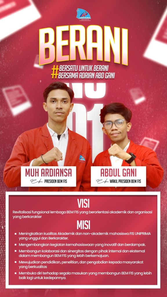 Wajo – Celoteh.Online – UNIPRIMA_ Pasangan Calon Presiden dan Wakil Presiden Badan Eksekutif Mahasiswa Fakultas Ilmu Sosial (BEM-FIS) Universitas Puangrimaggalatung (UNIPRIMA) nomor urut 1, Muh. Adriansa – Abdul Gani BERsama Adrian abdul gaNI dengan tagline BERANI MAJU & BERKARAKTER optimis akan membangun citra postif bagi Mahasiswa Fakultas Ilmu Sosial.