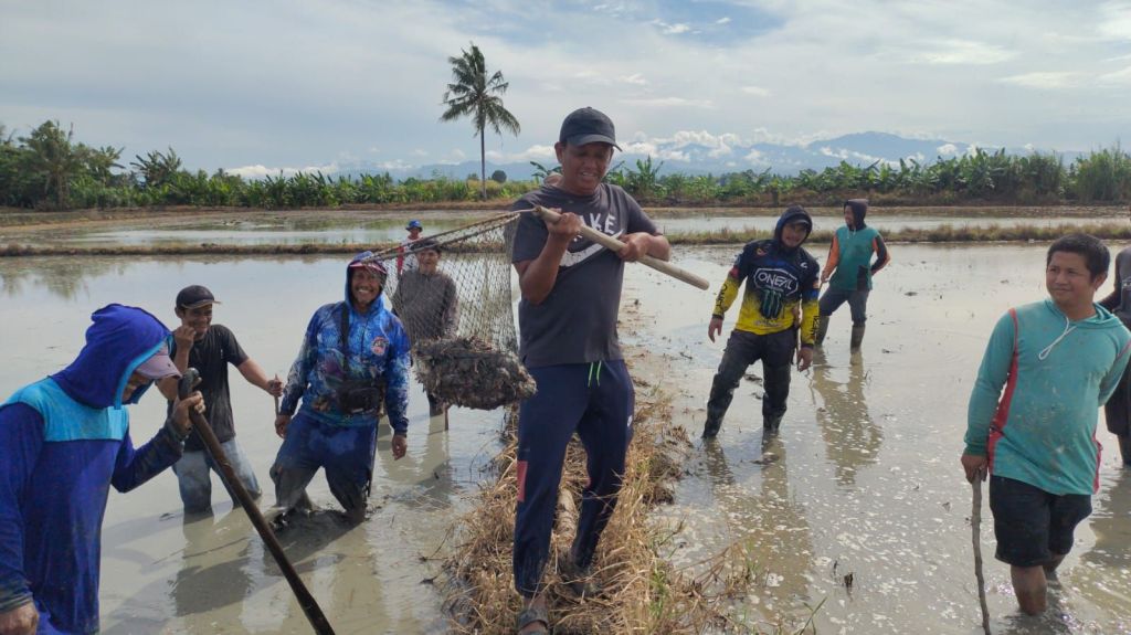Dengan karung di tangan, para petani berlari menyisir pematang, mengejar hama yang selama ini menjadi ancaman bagi hasil panen mereka. Setiap lubang diperiksa dengan teliti, sementara gelak tawa dan sorakan penyemangat mewarnai suasana meski ketegangan tetap terasa.
