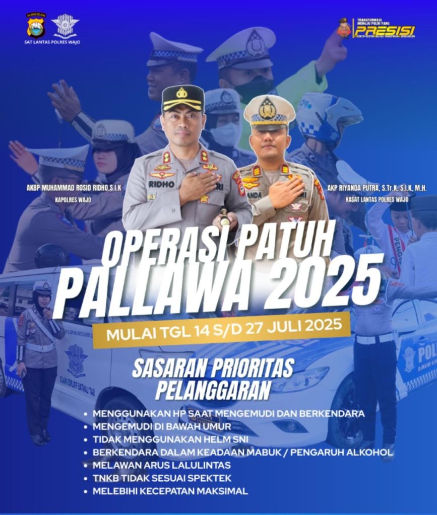 Wajo – Celoteh.Online – Polres Wajo melalui Satuan Lalu Lintas akan melaksanakan Operasi Patuh Pallawa 2025 yang dimulai pada tanggal 14 hingga 27 Juli 2025. Operasi ini bertujuan untuk meningkatkan kepatuhan masyarakat terhadap aturan lalu lintas dan menekan angka kecelakaan di jalan raya.