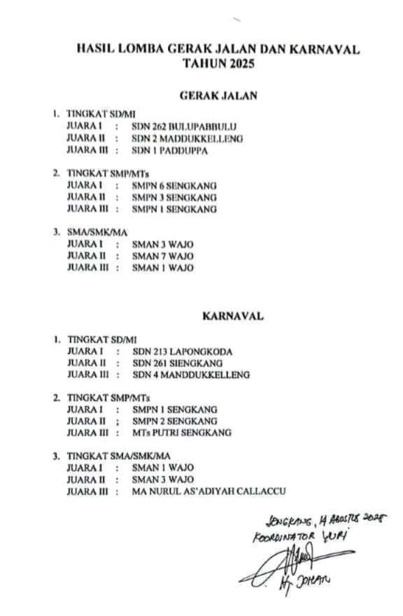 Sementara di tingkat SMP/MTs, dominasi sekolah di Kecamatan Sengkang terlihat jelas. SMPN 6 Sengkang meraih juara I, SMPN 3 Sengkang juara II, dan SMPN 1 Sengkang juara III.