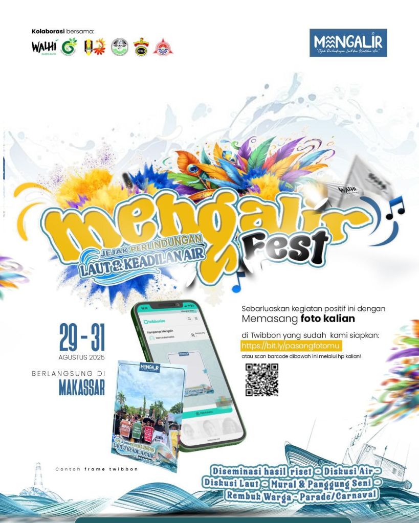Makassar, Celoteh.Online – Wahana Lingkungan Hidup Indonesia (WALHI) Sulawesi Selatan (Sulsel) bersama sejumlah komunitas bakal menutup Agustus dengan Mengalir Fest: Jejak Perlindungan Laut dan Keadilan Air, sebuah festival tiga hari yang memadukan riset, seni, dan aksi advokasi. Agenda ini digelar 29–31 Agustus 2025 di berbagai titik di Kota Makassar.