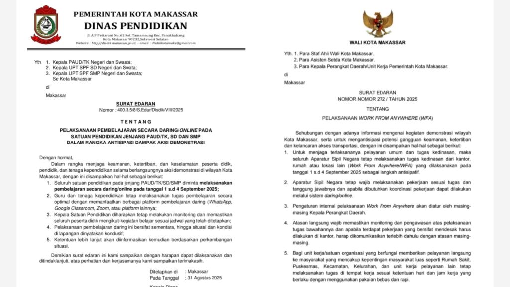 Pertama, ASN Makassar tetap melaksanakan tugas kedinasan dari kantor, rumah, atau lokasi lain (Work From Anywhere) pada 1–4 September 2025.