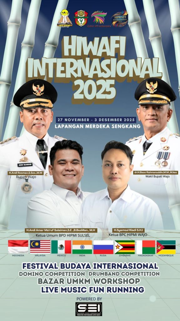 WAJO – Celoteh.Online – Himpunan Pengusaha Muda Indonesia (HIPMI) Kabupaten Wajo terus memantapkan persiapan menjelang pelaksanaan HIPMI Wajo Festival Internasional (HIWAFI) 2025, sebuah ajang berskala global yang untuk pertama kalinya digelar di Bumi Lamaddukelleng. Kegiatan tersebut dijadwalkan berlangsung pada 27 November hingga 3 Desember 2025 dan akan dipusatkan di Lapangan Merdeka Sengkang.