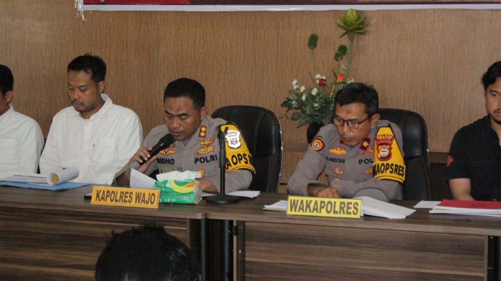 Konferensi pers dipimpin Kapolres Wajo AKBP Muhammad Rosid Ridho bersama jajaran pejabat utama Polres Wajo.